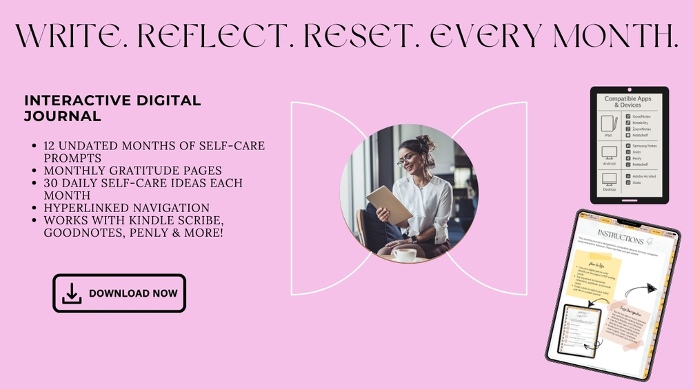 Monthly Undated Hyperlinked Interactive Digital Journal for Self-Care